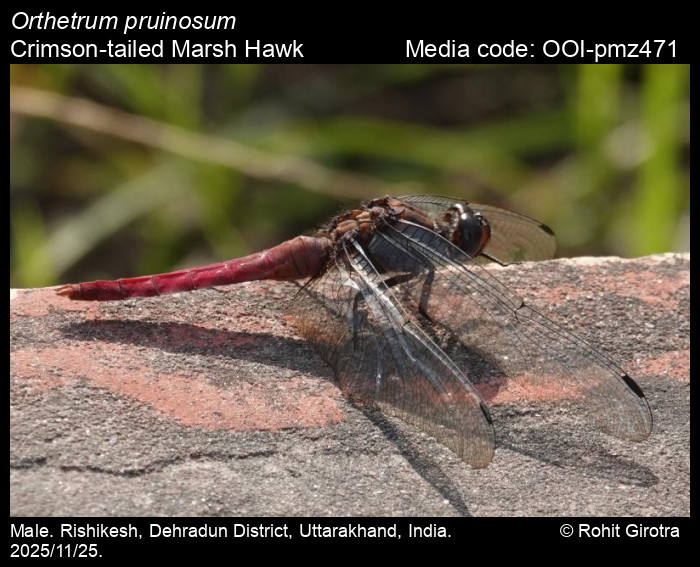 Anonymous 2026. Orthetrum pruinosum Burmeister, 1839 – Crimson-tailed Marsh Hawk. In (Chief Editors). Butterflies of India, v. . Published by the Indian Foundation for Butterflies. URL: https://www.indianodonata.org/orthetrum-pruinosum, accessed 2026/02/05.