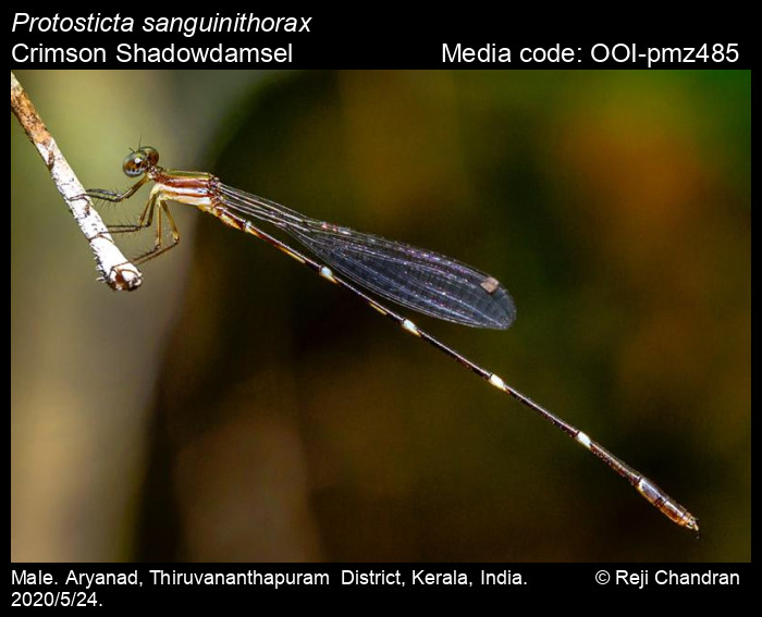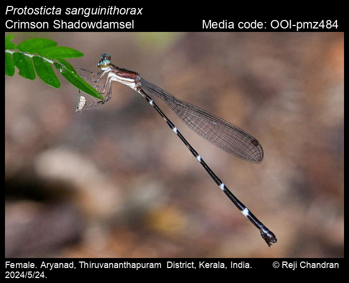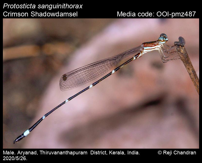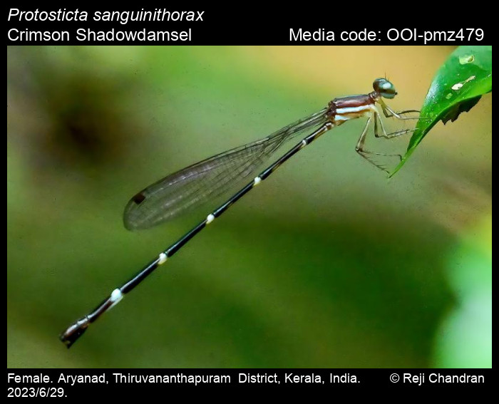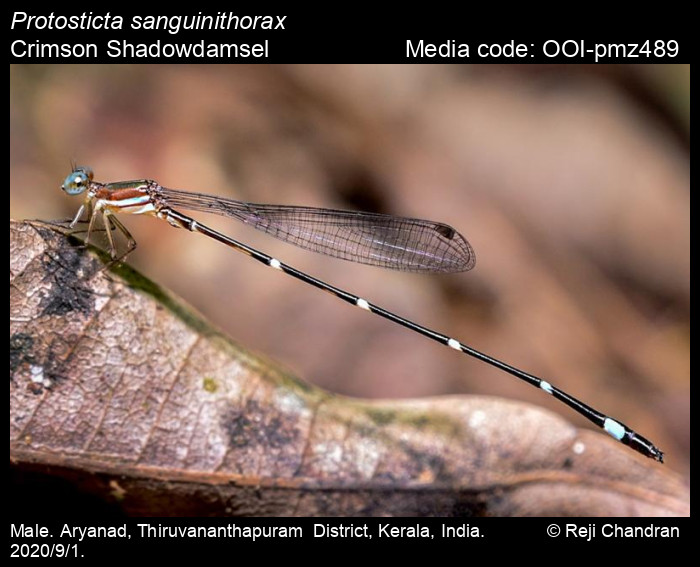 Anonymous 2026. Protosticta sanguinithorax Chandran A.V., Chandran R., Sawant, Koparde & Kunte, 2025 – Crimson Shadowdamsel. In (Chief Editors). Butterflies of India, v. . Published by the Indian Foundation for Butterflies. URL: https://www.indianodonata.org/protosticta-sanguinithorax, accessed 2026/02/07.