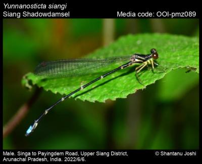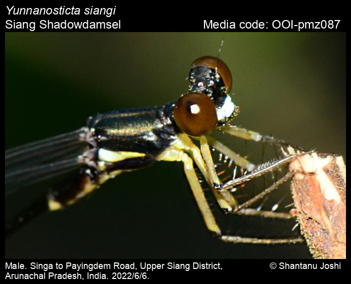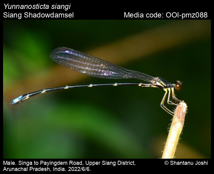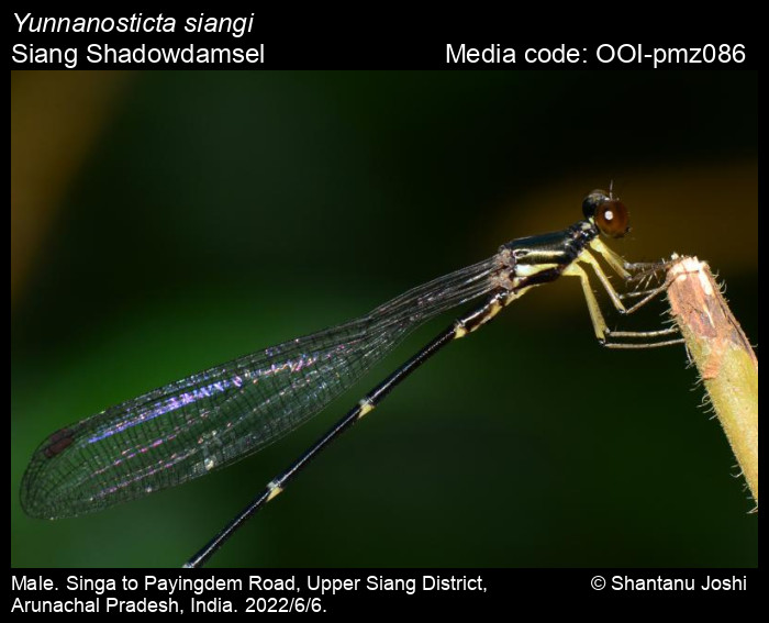 Kunte, K., S. Joshi, and D. Sawant. 2025. Yunnanosticta siangi Joshi, Sawant & Kunte, 2024 – Siang Shadowdamsel . In (Chief Editors). Butterflies of India, v. . Published by the Indian Foundation for Butterflies. URL: https://www.indianodonata.org/yunnanosticta-siangi, accessed 2025/10/30.